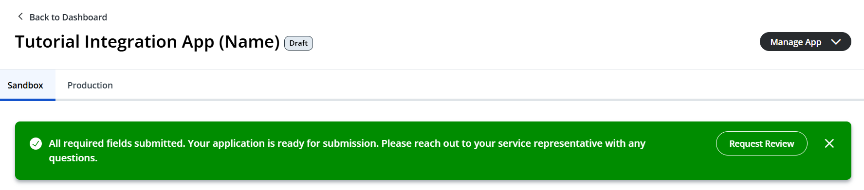 Create a new App (sometimes called an integration app) by entering a name and description. You’ll receive sandbox credentials (e.g., API client ID and secret) that let you test against a non-production environment.
